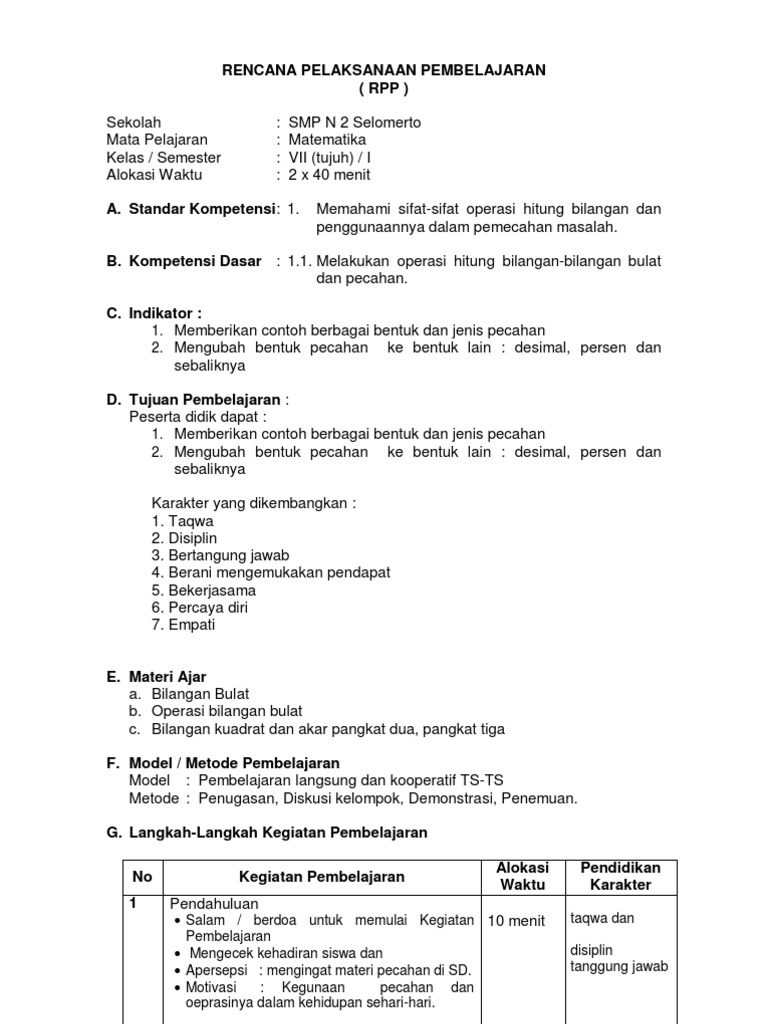 Rpp Kd 1 1 Melakukan Operasi Hitung Bilangan Bulat Copy